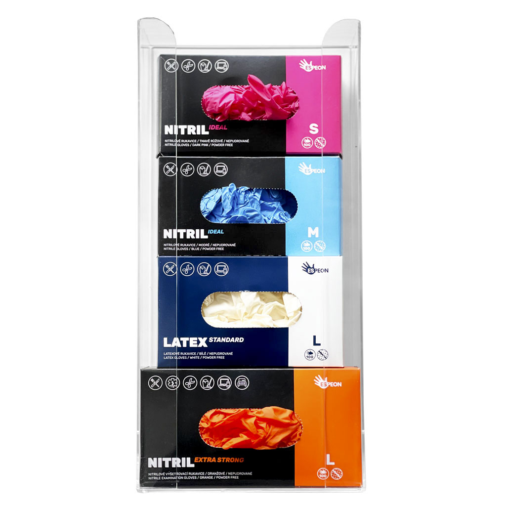 Zásobník je navržen pro standardní krabičky jednorázových rukavic a umožňuje jejich rychlé a pohodlné odebírání. Akrylátový materiál je pevný, odolný a snadno omyvatelný, což zajišťuje dlouhou životnost i jednoduchou údržbu.